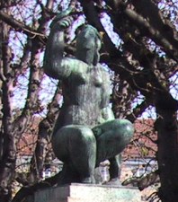 Bronzeplastik auf der Brunnensäule zeigt ein Mädchen, auf dessen Hand ein Vogel sitzt.