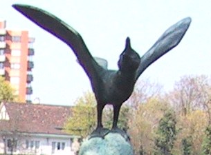 Plastik, die aus Bronze gegossen wurde, stellt eine Möwe dar, die vom Rhein herkommend auf dieser Kugel