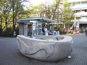 Brunnen aus Stein, auf dessen Rand zwei Wasserspeier stehen, hat breite