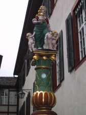 zu verdanken ist. Der Brunnentrog lehnt sich an das alte Gebäude. Die Figurengruppe stellt eine Mutter mit drei Kindern