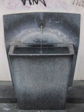 Brunnen, dessen Wasserspeier aus der Wandplatte ragt, lehnt sich an ein