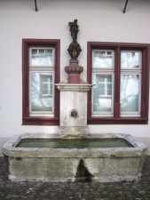 Der Brunnen hat einen rechteckigen Trog und leht sich an das Gebäude. Bereits