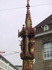 | Geschichte / Beschreibung: | Der Fischmarktbrunnen gilt in der Fachwelt als der schönste gotische Brunnen der Schweiz. Einst zierten 24 Figuren den Brunnen. Erfreulicherweise sind heute noch immer 22 (!!) davon erhalten. Es handelt sich um 13 Engel, 6 Heilige und 3 Propheten. Die drei Hauptfiguren stellen Maria mit dem Kind, ein Szepter in der Hand haltend, Petrus mit dem Schlüssel und den Evangelisten Johannes dar. Die Ecksäulen stehen für Gerechtigkeit, Beharrlichkeit und die Liebe. Der Brunnen muss regelmässig liebevoll gepflegt werden. Die letzte grössere Renovation stand zwischen 1971 und 1974 auf dem Programm, als die Vergoldung erneuert werden musste. | |