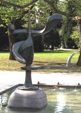 eine Kugel, auf der sich ein Gebilde aus Stangen erhebt. Der Park entstand auf dem Gelände des ehemaligen Friedhofs