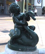 | Geschichte / Beschreibung: | Die Plastik aus Bronze steht über einem ovalen Trog und zeigt einen Knaben, der auf einem Schwan reitet. Zur Zeit seiner Entstehung diente der Brunnen vor allem als Tränke für Kutschenpferde. Wegen seines makellosen Weiss spielt der Schwan schon seit der Antike bei vielen Völkern als Symbol des Lichtes in der Mythologie eine Rolle. | |