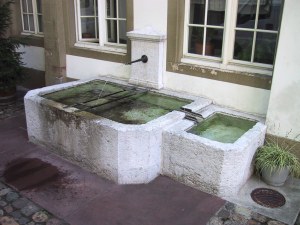 Brunnen aus Stein lehnt sich an das "Haus zur Mücke". Er