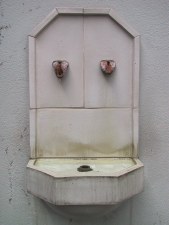 kleine Wandbrunnen "hängt" an einer Wand im Innenhof vom