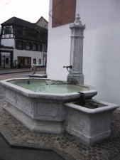 der achteckigen Brunnensäule ragt ein Wasserspeier. Der Brunnentrog,