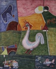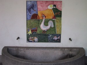 Geschichte / Beschreibung: | Der Trog hat die Form eines Halbkreises. Aus der Wand ragen zwei Wasserspeier und oberhalb des Troges ist ein schönes Wandbild angebracht. Das Werk namens "Sonnenaufgang" stammt von Otto Abt und zeigt einen krähenden Hahn, der inmitten einer schönen Landschaft steht. | |