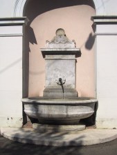 Muschel bekrönen diesen Brunnen, dessen Hauptteil in einer Nische liegt. |