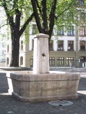 In der Mitte des viereckigen Troges steht die Brunnensäule, aus der an zwei Seiten Wasserspeier ragen.
