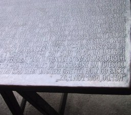 Geschichte / Beschreibung: | Basel ist reich an Brunnen aus alter und neuer Zeit. Auffallend ist, dass aber ausgerechnet auf dem grossen Marktplatz - ausser den beiden schlichten Brunnentrögen (Brunnenführer-Referenzen: 77 / 78) - kein Brunnen steht, der Akzente setzen kann. 1888 wurde ein Wettbewerb für einen "würdigen" Brunnen für den Marktplatz ausgeschrieben. Es wurden zwar drei Projekte prämiert, ausgeführt wurde aber keines. 1930 folgte ein weiterer Wettbewerb, woraus die oben erwähnten beiden Tröge entstanden. 1979 gab es erneut einen Wettbewerb. Trotz vieler guter Ideen ist auch hier nichts geschehen. Anlässlich ihres 100jährigen Bestehens im Jahre 1986 wollte die damalige Sandoz AG der Stadt ein Geschenk in Form eines Brunnens machen. Die Hoffnung auf einen Marktplatz-Brunnen musste man aber - nachdem bereits zuvor kritische Stimmen aufgekommen waren - mit der Umweltkatastrophe bei Schweizerhalle vom 1. November 1986 endgültig begraben. Die Künstlerin musste infolgedessen ihre bereits begonnene Arbeit stoppen. Ihre bis zu diesem Tage hergestellten Stücke können nun im Münster besichtigt werden. Auf einem der Teile wurde der Text, "Die Vergänglichkeit", von Johann Peter Hebel gegossen. | ||