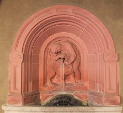 "NICHT IN DER BLÜHT UND PURPURTRAUB, QUILLT HEILIGE KRAFT ALLEIN ES NÄHRT DAS LEBEN VOM LEIDE SICH" Der Brunnen befindet sich in einer Nische. Auf dem Reliefbild ist ein Mann zu sehen, der mit einem Löwen kämpft. |