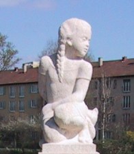 Geschichte / Beschreibung: | Auf der Brunnensäule, aus der ein Wasserspeier ragt, sitzt ein Mädchen mit einer Katze. Die Brunnenschale ist oval und unten an der Säule hat es eine Hundetränke. | |